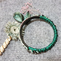 ![]() | ARF027 | Kimono Bangle(Teal)Genuine leather base, vintage kimono details, toho beads, fine cotton yarn in teal wrapped around a row of diamonte. | SOLD | |